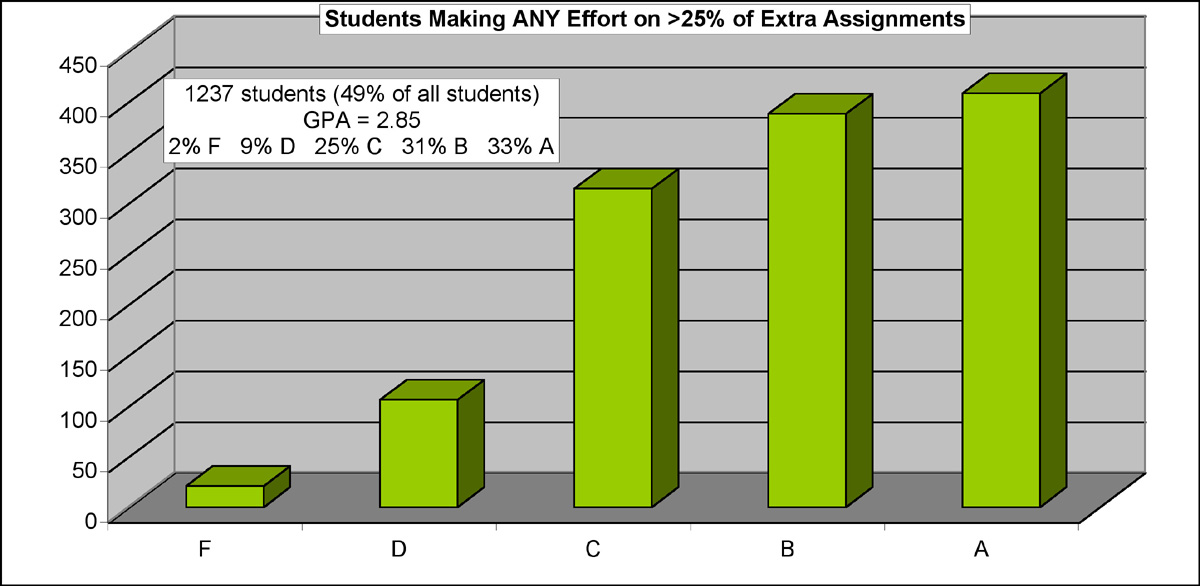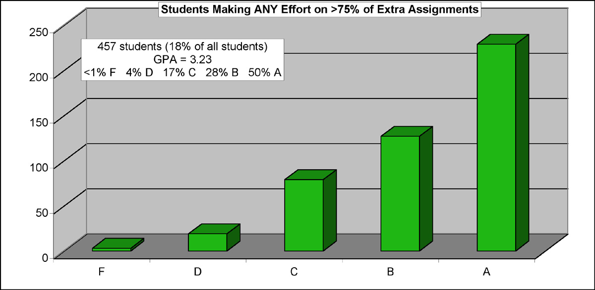 category, involving the students making either a Good or Fair effort on the extra homework, you would find an overall 2.85 GPA, with a six to one ratio of good grades to bad grades.