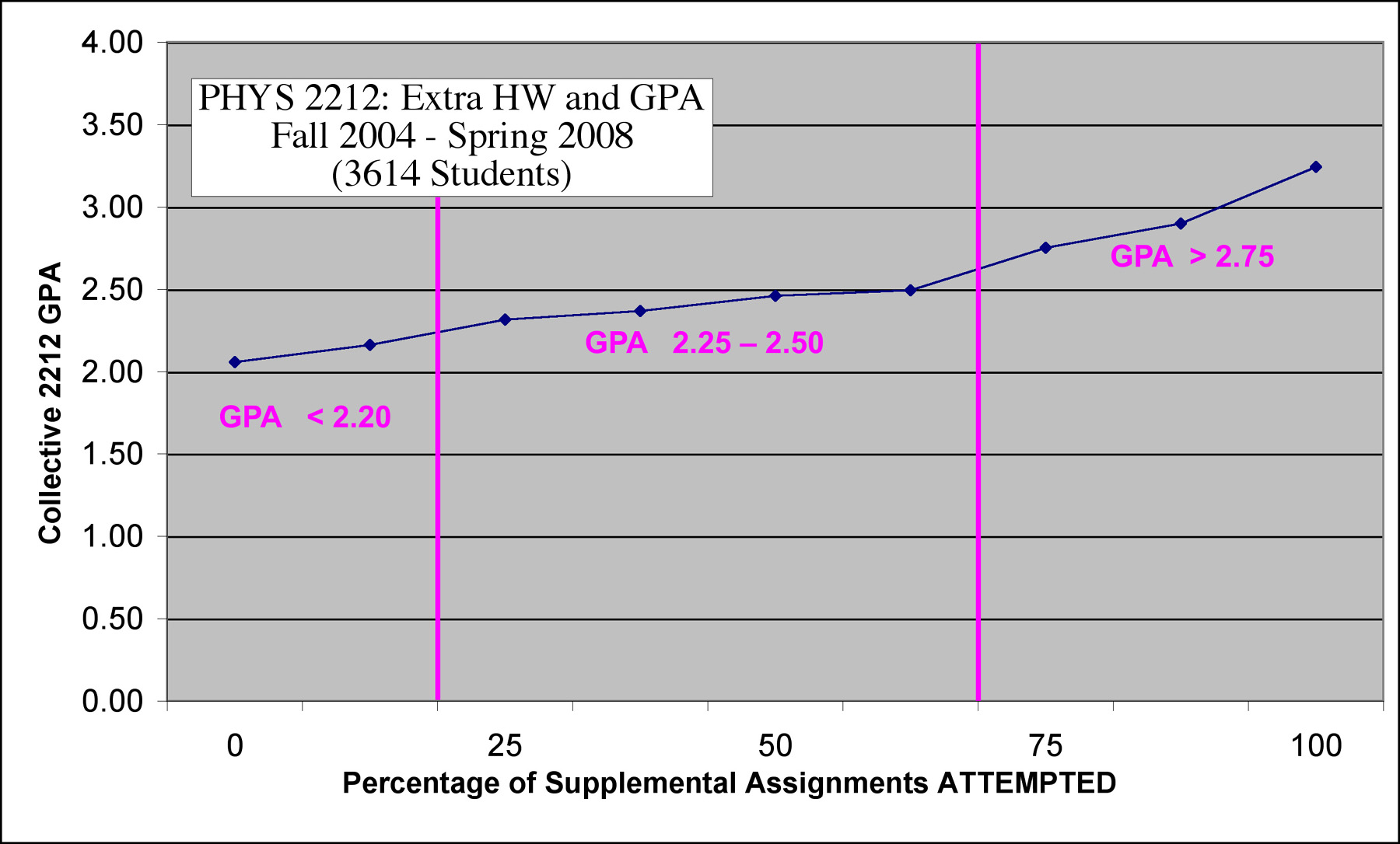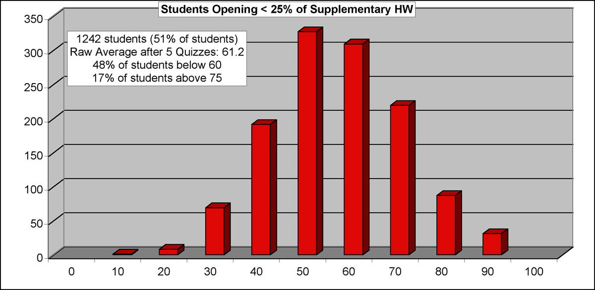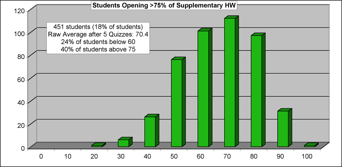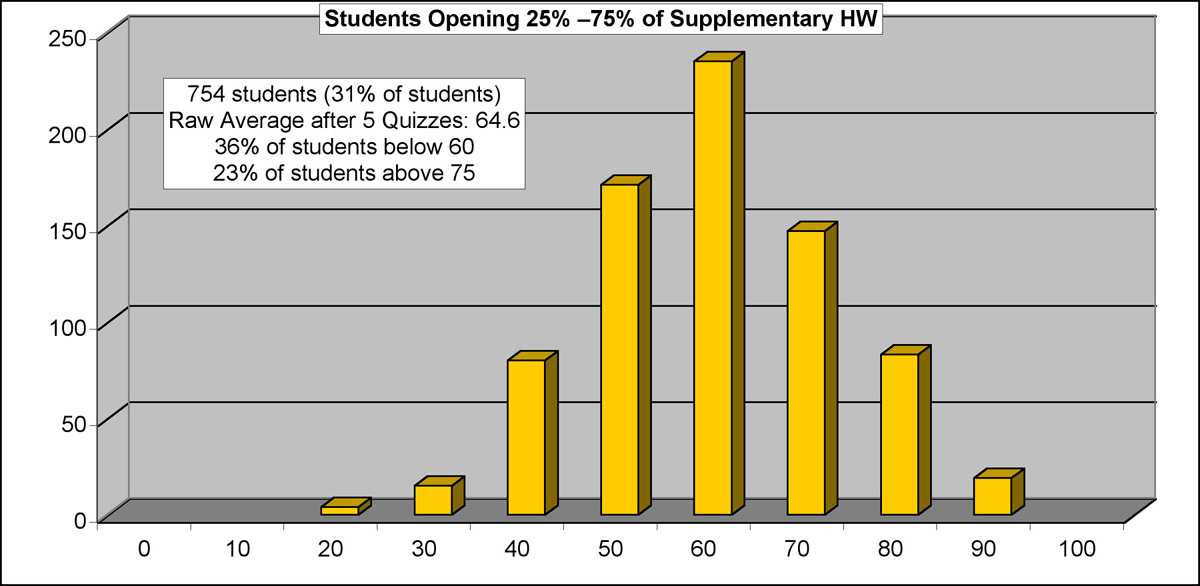 It is a common practice for Introductory Physics instructors to set up the online homework system to include Supplemental (or Bonus) Assignments, over and above the required minimumhomework load. It is a common practice for Introductory Physics students to ignore this extra homework, assuming that the cost-to-benefit ratio does not justify the extra effort. Below, you will see a compilation of actual data regarding the impact of such extra homework on student performance. Before you make any assumptions about the value of doing these assignments, you should take some time to look over this information.